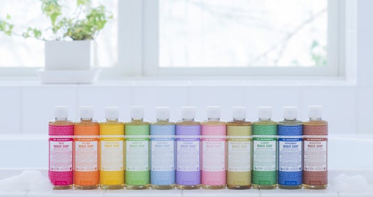 ドクターブロナーを代表する製品である「マジックソープ」は、天然由来成分100%のオーガニックマルチソープです。顔や体だけでなく、食器洗いや部分汚れのお洗濯など1本で多用途に使えます。エコロジカルで高い品質が支持されて、2000年から25年連続全米売上げNo.1*のナチュラルソープに選ばれています。(*SPINS社調べ 2000年~2024年)