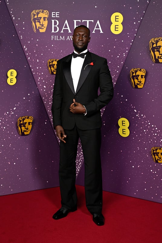 イギリスのラップスター、ストームジー(Stormzy)は、サテンディテールを配したブラックのウール モヘア シングルブレスト タキシードに、ブラックのシルクボウタイ、カマーバンド、ホワイトのタキシードシャツを合わせたクラシックなイブニングルックで登場しました。