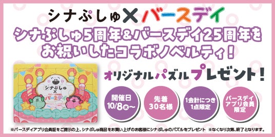 今年で5周年を迎えた『シナぷしゅ』と25周年を迎えた『バースデイ』がコラボしました。10/8(水)よりコラボ商品を販売します。また、『シナぷしゅ』商品をお買い上げの各店先着30名様に、『シナぷしゅ』のパズルをプレゼントします。