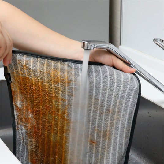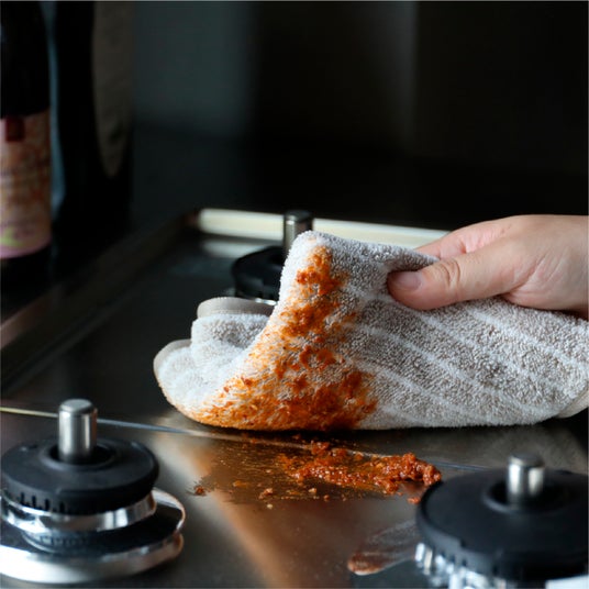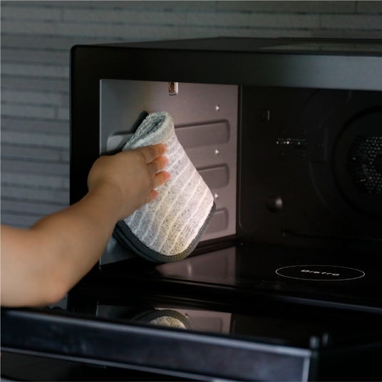 - 水拭きだけでしっかり落とせるマイクロファイバー料理時にコンロ周りへ飛び散った油汚れや電子レンジ内の汚れも、水で濡らしてサッと拭くだけ。