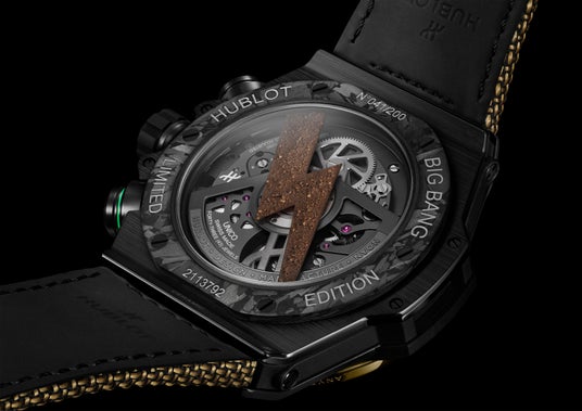 「ビッグ・バン リローデッド ウサイン・ボルト」は、ボルト氏を象徴するコードで時を再構築しています。6時と8時の間にある数字は「6・5・8」と読み取れますが、視点を反転させると、2009年に彼が樹立した100mの世界記録「9.58」を示します。稲妻型のクロノグラフ秒針は、彼の象徴的なポーズを想起させ、ポリッシュ仕上げの18Kイエローゴールドのベゼルには、彼の信条である「Anything is Possible, Don’t Think Limits.(不可能はない、限界を考えるな)」が刻まれています。
