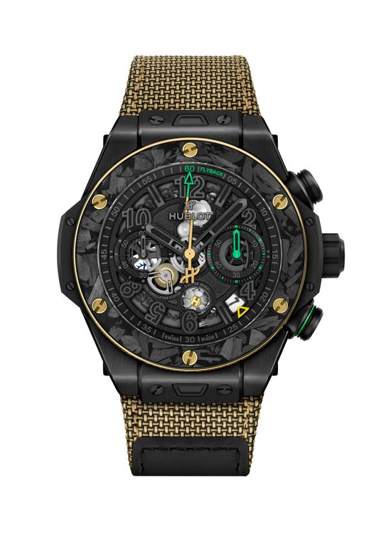 これらの特徴的なディテールは、ボルト氏のルーツ、歩み、そして記録を塗り替えてきたレガシーへと直接つなぐものです。このモデルには、交換可能な「ワンクリック」システムによる2種類のストラップが付属します。1つはイエローゴールドトーンのベルクロファブリック、もう1つはブラック、イエロー、グリーンのカモフラージュラバーストラップです。内部には、ダイアル側にコラムホイールを備えた自社開発・製造HUB1280「ウニコ」フライバック クロノグラフ キャリバーが搭載され、約72時間のパワーリザーブを誇ります。「ウニコ」ムーブメントが主役となり、コラムホイール、オシレーティングクラッチ、フライバック機構がこれまで以上に視認性を高めています。ジャマイカのグリーンとイエローが、稲妻型のクロノグラフ針、コラムホイール、フライバック表示といった主要な要素を際立たせています。18Kイエローゴールドとフロステッドカーボン製のベゼルは、6本のH字型ゴールドビスで固定されており、これはボルトの表彰台と揺るぎないレガシーへのオマージュとなっています。