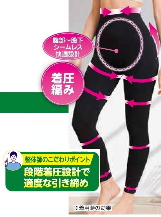 段階着圧仕様で、「お腹・お尻・脚」をトータルサポート。腹部~股下には「センターシームレス設計」を採用し、摩擦や引っ張りを軽減。快適なフィット感を実現しました。