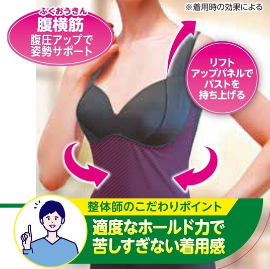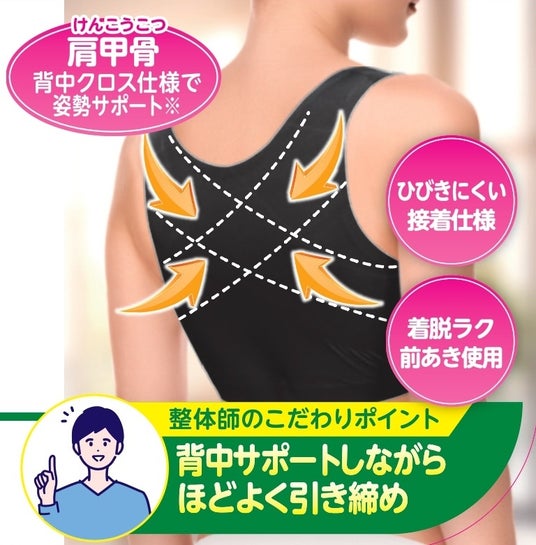 背中をサポートしながら、ほどよく引き締めます。アウターにひびきにくい接着仕様や着脱がしやすい前あき仕様もポイントです。