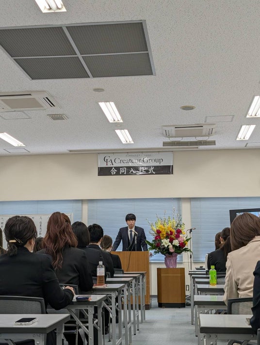 入社式では、社長の祝辞、新入社員代表からの抱負、先輩社員からの激励の言葉がありました。