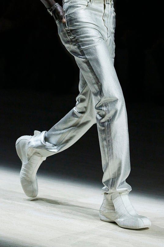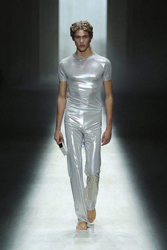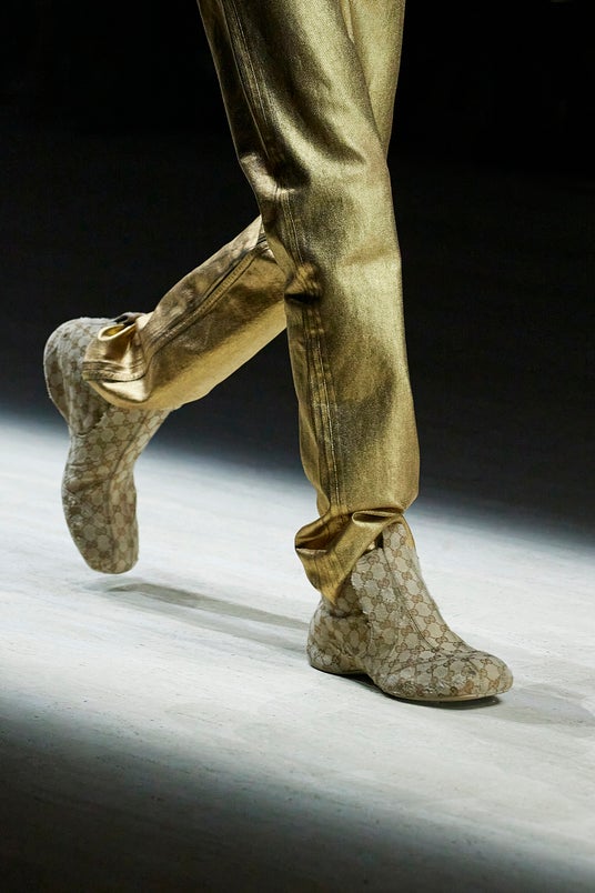 フィットしたトップスとスレンダーなパンツのパーティーボーイ風ツーピースは、贅沢な装飾に包まれ、足元は裸足です。その華麗さと共鳴するように、ウエストまでの大胆なスリットの入ったドレスやミニドレス、そして、大きく開いたバックスタイルから、10カラットのダイヤモンドをあしらったホワイトゴールド製のGGタンガがのぞくドレスが、ショーを締めくくります。