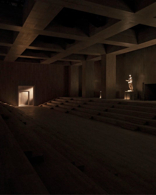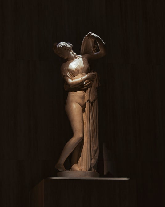 私の美意識を育んできた彫像作品からのインピレーションは、ルネサンスが理想とした均整のとれた肉体美を想起させるアドニス ルックへと昇華しています。さらに、ギリシャ彫刻のようにドレープをまとったTシャツと組み合わせたスケータールックや、《ヴィーナスの誕生》を思わせるホワイトのスレンダーなドレスへとつながっています。