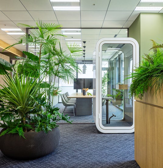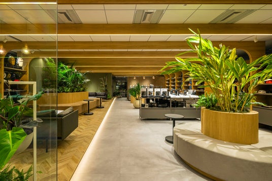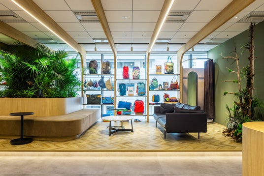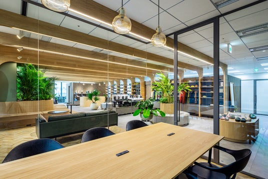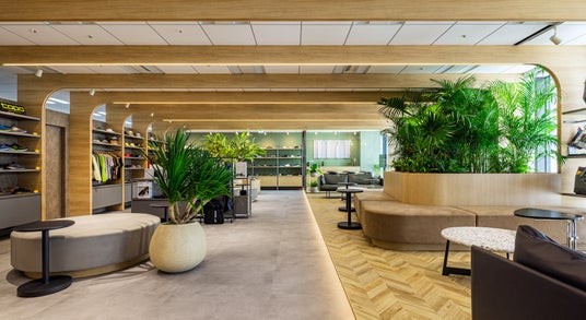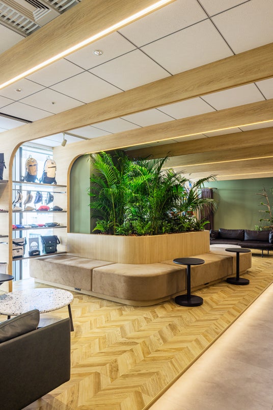 内装のテーマには、「ここに集う人がワクワクするオフィス」を掲げました。「木」「土」「緑」をキーワードに、自然の中で触れられるようなやわらかさややさしさを取り入れているのが特徴です。例えば、ショールームの天井には1.2メートルピッチで「木」製の梁を配置し、商品展示用什器の側板にするとともに空間全体をやさしく包み込みました。あえて自立させた倉庫用の2つの箱にはテラコッタ系の「土」壁を表現し、人目に触れやすい動線上に設置。さらにショールームの中央部に中庭を設け、どこにいても視界に入ってくるような「緑」のボリュームゾーンも計画しました。これらはロゴや企業理念(いずれも詳細後述)に込めた想いを実現するためのデザインでもあり、多くの人がそれぞれの空間で心地よく商談やミーティングを進められるような構成にしています。