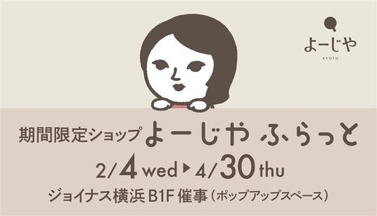 株式会社よーじや(京都府京都市下京区、代表取締役・國枝昂)が運営する、京都発のライフスタイルブランド「よーじや」は、2026年2月4日(水)~4月30日(木)の期間、ジョイナス横浜にて期間限定ショップ「よーじやふらっと」を開催いたします。約3ヵ月にわたる本イベントでは、期間限定「あおゆらら」シリーズや新商品などを幅広くご用意。さらに、購入条件に応じたプレゼントキャンペーンなども実施し、スペシャルな内容となっております。この機会にぜひお立ち寄りください。