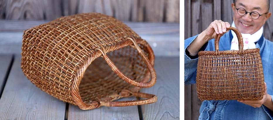 「あけびこだし編み手提げ籠バッグ」が新発売。国産あけびの良質な蔓のみを厳選し、手間のかかる材料取りから丁寧に仕立てた手提げ籠バッグは、職人が伝統技法で編み上げた、使うほどに色艶が深まる逸品です。