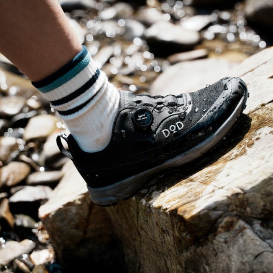 撥水・速乾性に優れたタフなテープ構造で、岩場やキャンプなどハードな路面でも頼もしい一足。