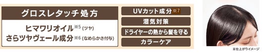 グロスレタッチ処方で長時間ツヤめく光沢ヴェール。スタイリングの仕上げに使用すると毛先まで指どおりなめらかなツヤ髪へ。