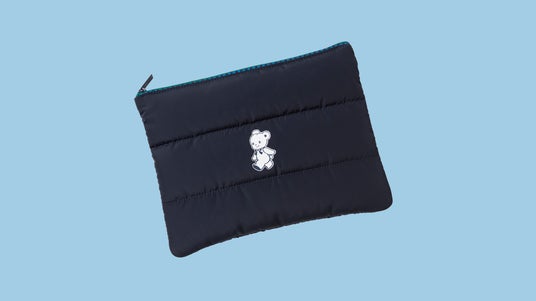 クマちゃんのマークがプリントされたシンプルなデザインのポーチ。クッション性が高く、タブレットの持ち運びにも便利です。