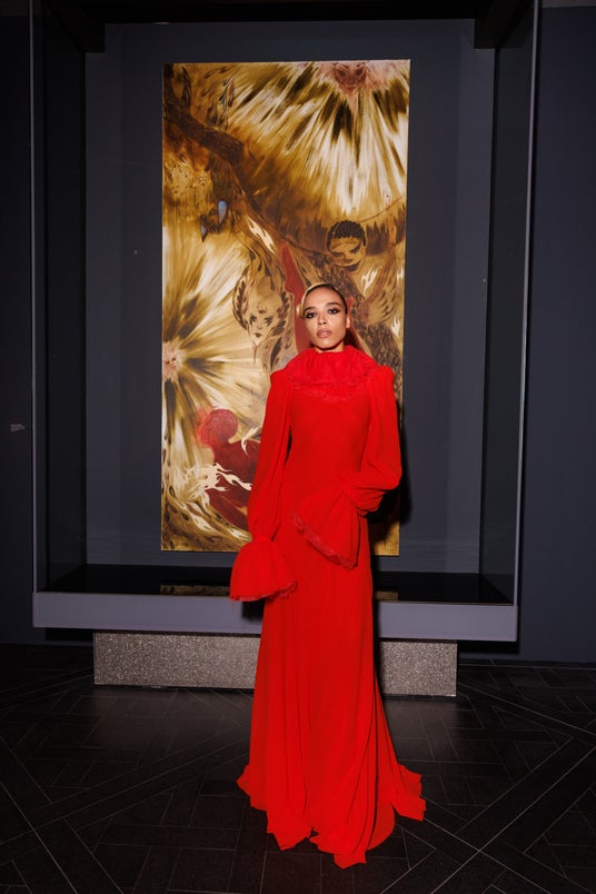 2025年秋冬コレクションより、 レイヤードフローラルレースをあしらったポピーレッドのシルクジョーゼット ハイカラードレスを着用しています。