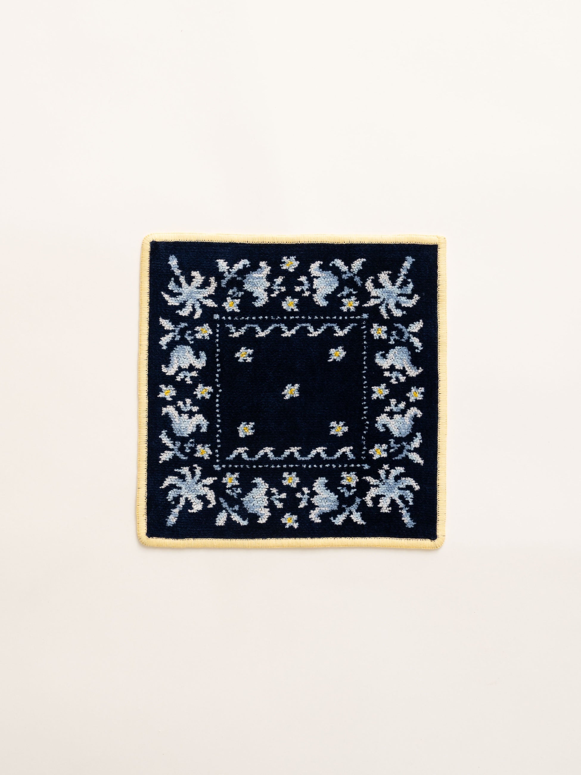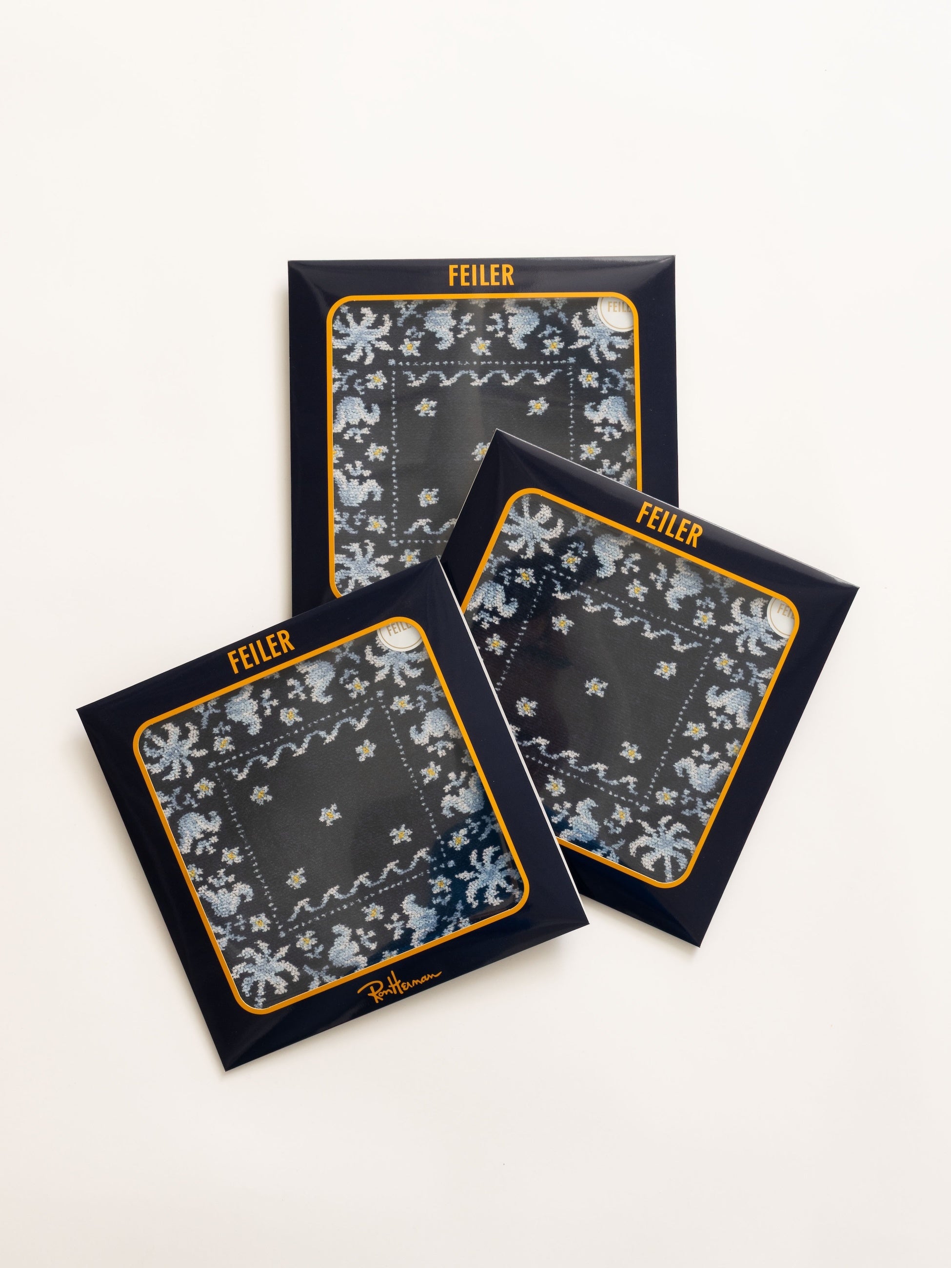 柔らかで厚みのある質感と多彩な色から織りなす奥行きのある美しい発色が魅力のシュニール織は、一方で細かな柄を表現するには丁寧な図案づくりと熟練された職人による調整が欠かせません。本企画ではバンダナ特有の繊細な柄を再現するため、幾度にもわたる試作を重ねました。そうして完成したのが、FEILERの伝統的なものづくりとロンハーマンらしさが融合した唯一無二のハンカチです。
