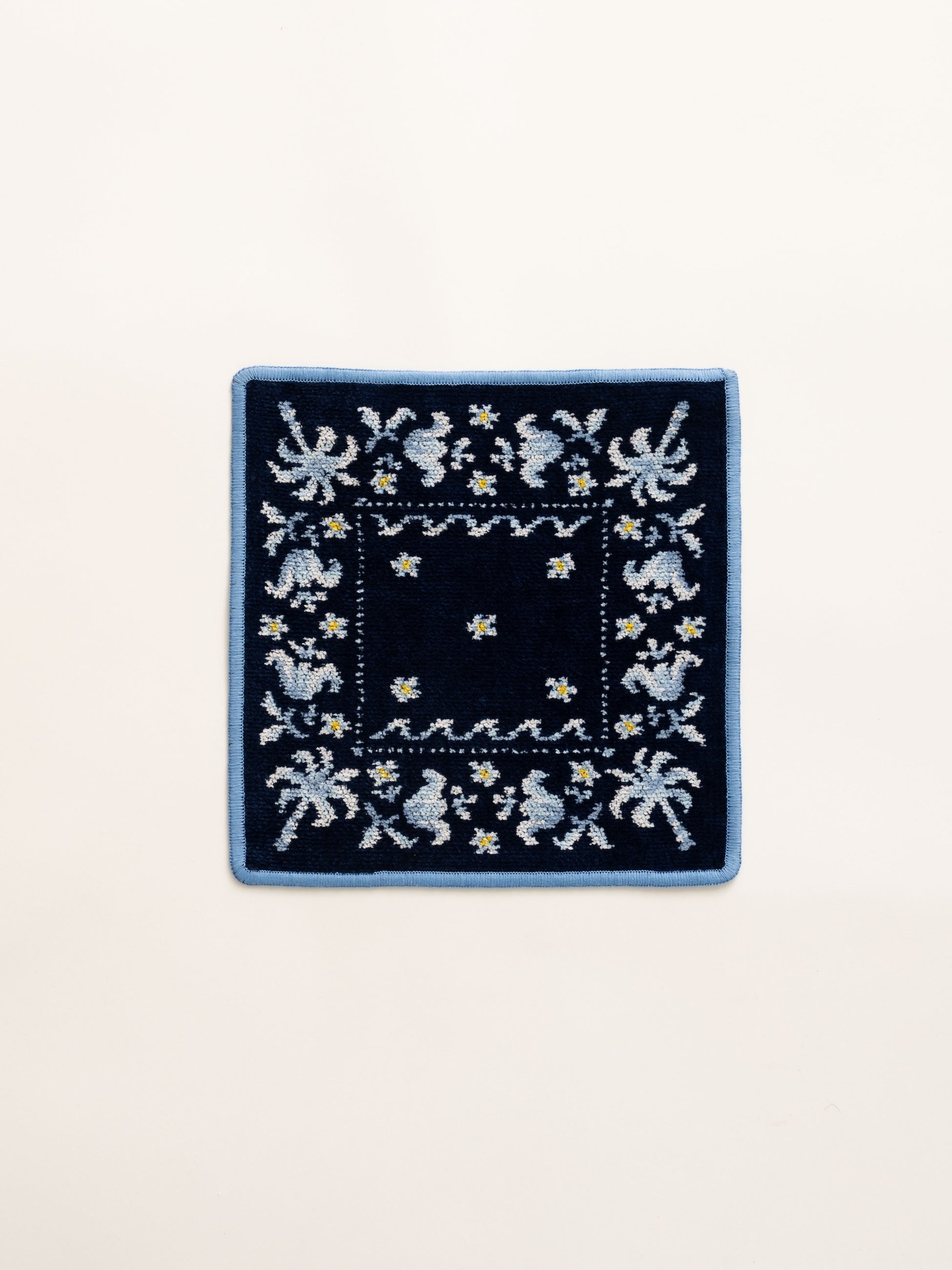 初となるコラボレーションで特別にオーダーしたのは、ロンハーマンらしいパームツリーや波模様など、ボタニカルモチーフを用いたバンダナ柄。カジュアルな図柄をクラシックで上品なシュニール織で描きました。