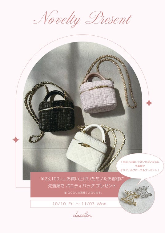 dazzlin:dazzlin商品を23,100円(税込)以上お買い上げで「バニティバッグ」プレゼント(数量限定)