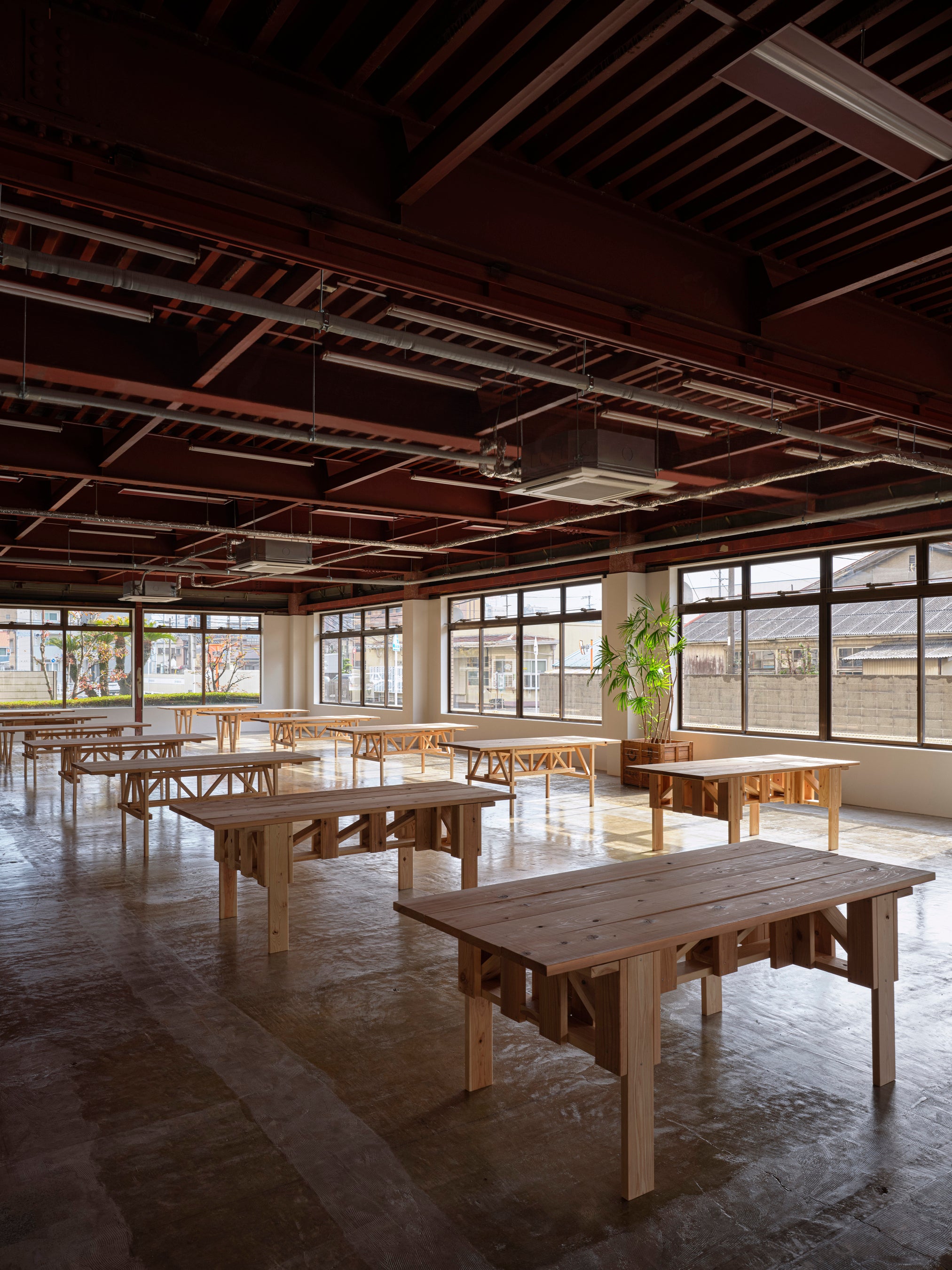 フリースペースの机と椅子は、すべて社員の手によるもの。4種類のテーブルが並びます