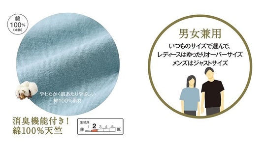 綿糸から改善した「消臭機能付きTシャツ」なので、手間なくニオイ対策ができます。また、綿100%素材なので、吸水性もよく、やさしい肌あたりもポイント。