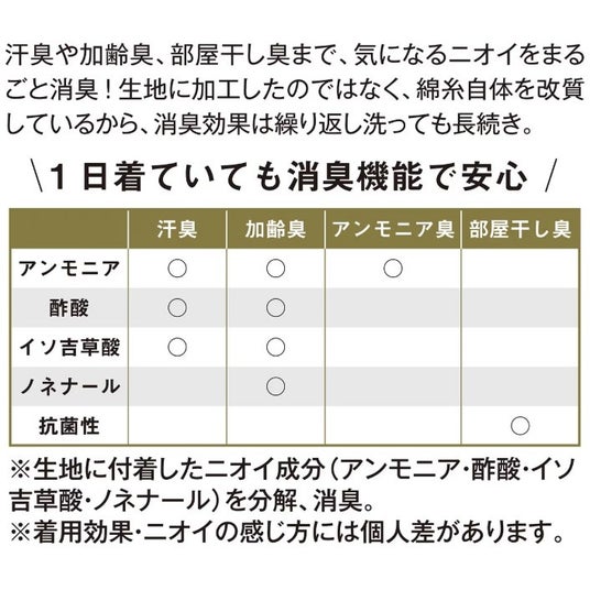 (※生地に付着したニオイ成分(アンモニア、酢酸、イソ吉草酸、ノネナール)を分解・消臭。※着用効果、ニオイの感じ方には個人差があります。)