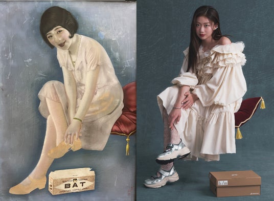 大正から昭和初期の実際のポスターを再現すると伺い、その時代からポスター文化があったことにとても驚きました。今は「昭和レトロ」といった言葉が注目されている時代でもあるので、当時実際に存在していたものと現代的な感覚を重ね合わせることで、すごく面白い表現ができるなと感じて、今までにない撮影になるんじゃないかと撮影前からワクワクしていました。履きやすくて、どんなコーデにも馴染むデザインもお気に入りです!