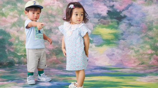 「Blooming Garden」をテーマに鮮やかなお花のアートと春らしい色合いがポイントのコレクションを展開。爽やかなブルーとグリーンのカラーリングが魅力的なオリジナルのリバティ生地も、ベビーからキッズ(60cm~130cm)のスタイルに共通して登場いたします。