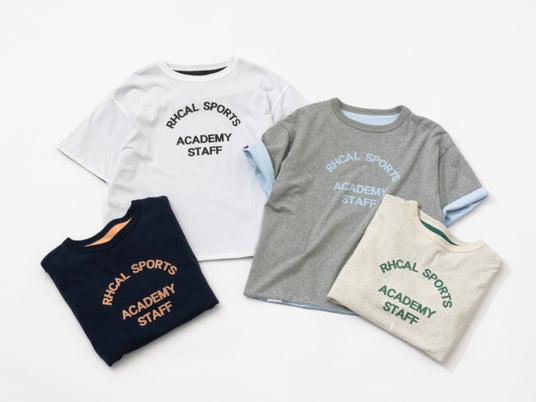 架空のスポーツアカデミーのスタッフTシャツをイメージし、スポーツカルチャーをRHCらしく表現した、遊び心のあるリバーシブル仕様のデザインに仕上げました。リバーシブルならではの仕様として、RHCが色の組み合わせにもこだわり、全4色で展開。表面にはオリジナルロゴをフロントに大胆に配し、裏面は袖を折り返すことでレイヤードしているかのように見えるデザインとなっています。