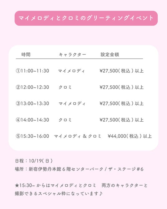 ※最終枠(マイメロディとクロミ、両方のキャラクターと撮影できるスペシャル枠)のみ金額が異なりますので、お気を付けください。