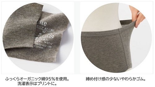 1.ウエスト・足口のゴムは身生地でくるみ、通常肌側の縫い代を表側にすることで肌あたり良く仕上げました。洗濯表示は身生地にプリントしています。