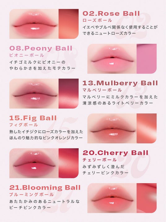 今回販売するカラーは全部で6色。リップポーションシュガーグレーズティント日本限定色として大人気なピオニーボールも、ミニサイズになって登場!