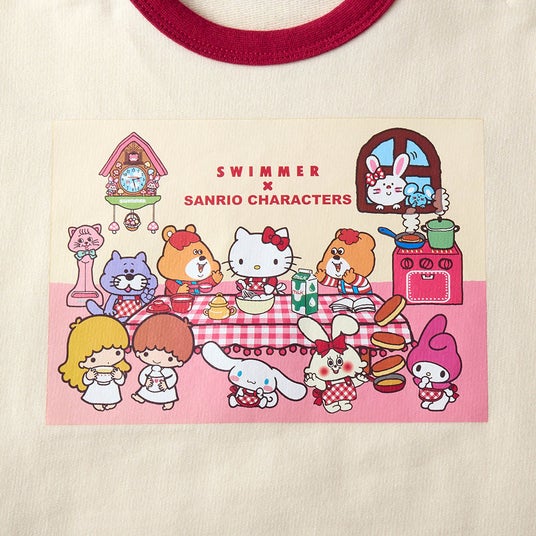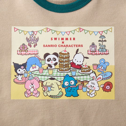 フロント部分にはスイマーオリジナルの動物のキャラクターと、サンリオキャラクターズが仲良くテーブルを囲むイラストをプリントしました。袖にはチェック柄をデザインし、可愛くポップなデザインに仕上げています。