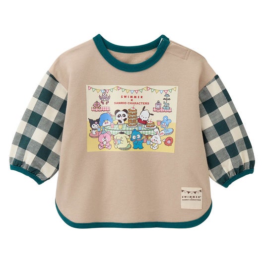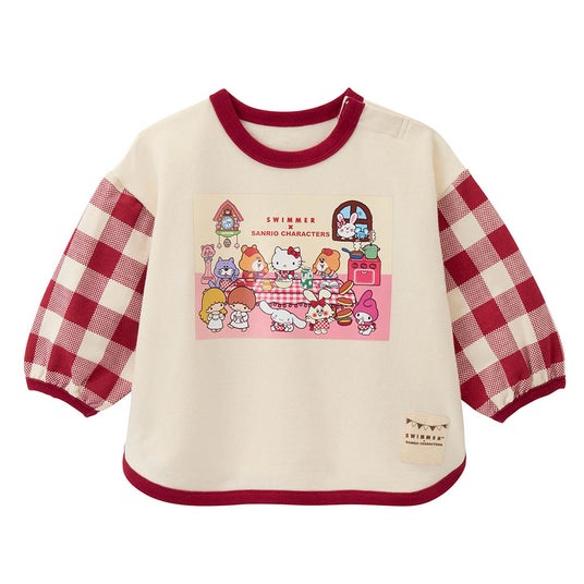 ハローキティ、マイメロディ、シナモロール、リトルツインスターズ(キキ&ララ)とスイマーのキャラクターがテーブルで仲良くパンケーキ作りを楽しんでいるデザインをプリントしました。アイボリーの身生地に赤いチェック柄の袖が映える遊び心のあるデザインです。