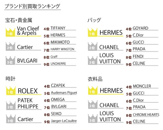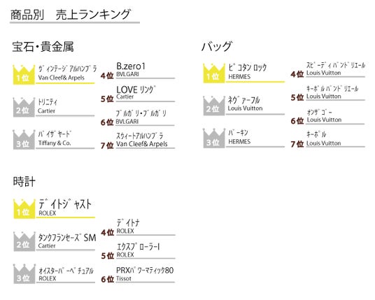 買取も販売も、一位、二位、三位のエルメス、シャネル、ルイヴィトンは言わずとしれたフランスの三大ブランド。世界的な流通量から考えると、ルイヴィトンが圧倒的に多いが、それを抑えて買取も販売も、エルメスが上位に。なお、バーキン、ケリーをおさえ上期に販売で人気だったのがエルメスのピコタンロック。