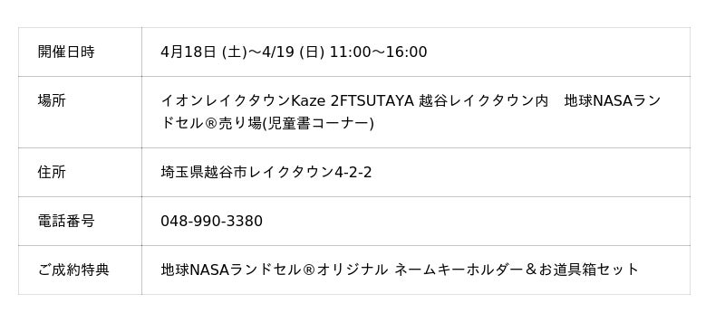 ランドセルの企画・販売を行うCHIKYU株式会社(東京都港区、代表取締役:辻谷安央)は、埼玉・TSUTAYAレイクタウン「地球NASAランドセル(R)受注会」を開催いたします。