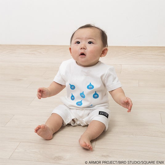 ドラゴンクエスト知育絵本「スライムぴぴぴ」に登場するスライムたちがデザインされたサロペット風デザインが可愛らしい、毎日着せやすい一枚です。