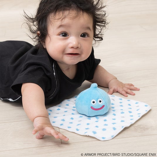 メタルスライムのぬいぐるみが付いた、赤ちゃんの手にぴったりのにぎにぎタオル。