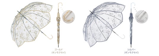 秋の訪れを告げる、可憐で温かみのある"金木犀"と、奥ゆかしく佇む"銀木犀"がモチーフのビニール傘。秋空を舞う花びらをイメージした大人かわいいデザインになっており、生地のフチを彩るパイピングは満開の花のように優雅な曲線を描きます。持ち手の色合いは、それぞれの雰囲気に合わせたゴールド、シルバーで上品に仕上げました。