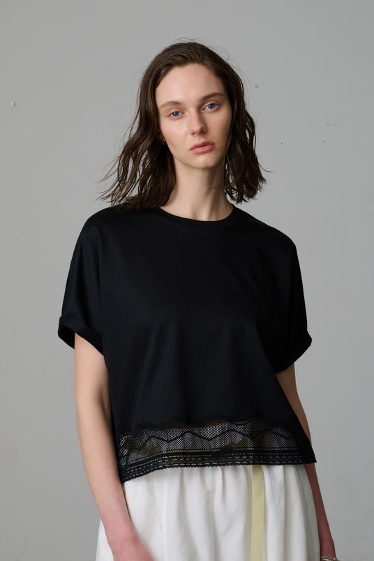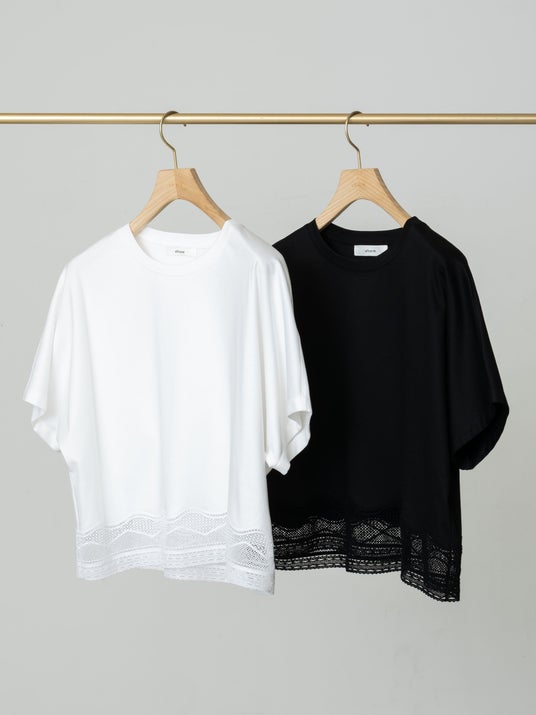 ミニマルで上品な続き袖デザインのTシャツは、スッキリとした短めの丈と、裾にレースをあしらうことで、より爽やかな軽さがあるスタイリングを楽しめます。