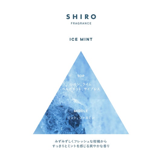 シュッっとひと吹きした瞬間、目が覚めるようなメントール*1が突き抜け、トップノートのレモンやライム、ベルガモット*9のフレッシュなみずみずしさが重なります。爽やかな柑橘系からやがて、凛としたミントとジャスミンのフローラルが溶け合うミドルノートへと移り変わります。肌に心地よいクール感*6をまとわせながら、清潔感と爽快感あふれる香りが全身を包み込み、気分をリフレッシュさせてくれる香りです。