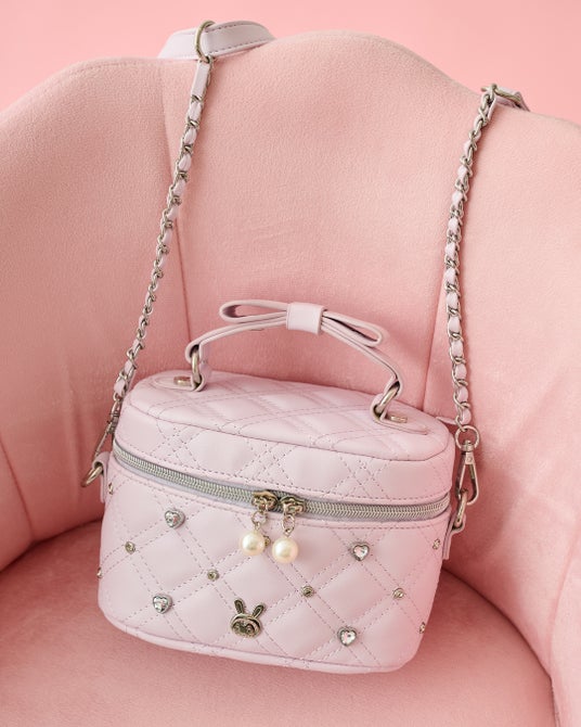 リボン付きの持ち手にキラキラのビジューをあしらった、華やかで可愛らしいバニティショルダーバッグ。淡いピンクカラーとベリエちゃんプレートがポイントで、内側の裏地も総柄デザインになっており、かわいさ満点です。