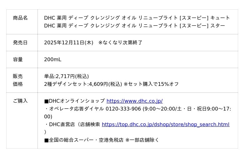 株式会社ディーエイチシー(本社:東京都港区、代表取締役社長:宮崎緑、以下:DHC)は、透明感※1のあるクリアな肌へ導く「DHC 薬用 ディープ クレンジング オイル リニューブライト」を、<スヌーピー>をフィーチャーしたパッケージで、2025年12月11日(木)より発売いたします。
