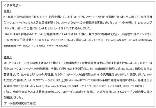 ◆ HA4が光老化した皮膚で増加する炎症性マクロファージの分極誘導を抑制し、炎症性サイトカインの発現を低下させることを確認