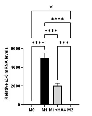 まず、炎症性のM1マクロファージへの分極誘導過程にHA4を添加したところ、M1マクロファージの代表的な炎症性サイトカインであるIL-6の遺伝子発現量が有意に低下することが確認されました。(図2)