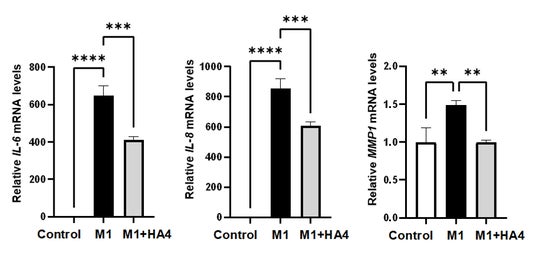 一方で、HA4処理したM1マクロファージ由来の上清(M1+HA4)を用いた場合、これらの炎症性サイトカインおよびMMP-1の発現は有意に抑制されました。(図3)