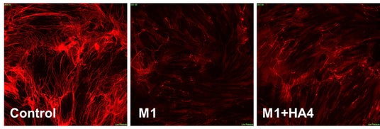 さらに、免疫蛍光染色と蛍光顕微鏡による観察の結果、通常の線維芽細胞が産生するコラーゲン線維(Control)と比較して、M1上清を添加した条件ではコラーゲン線維の量が減少していることが確認されました。一方、M1+HA4上清の条件では、コラーゲン線維の形成が改善されていることが明らかとなりました。(図4)