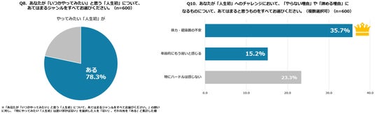 一方、挑戦を妨げるハードルを尋ねたところ、「体力・健康面の不安」が35.7%で最多となりました。また、「年齢的にもう遅い」(15.2%)も多く回答として挙げられ、体力と年齢を理由に人生初を断念する人が多くいました。