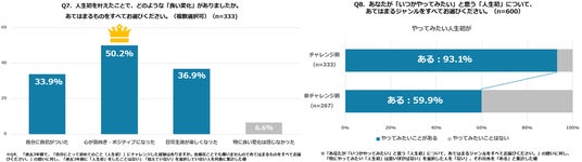 注目すべきは、挑戦がもたらす心身への好影響です。「人生初」に踏み出した人のうち、50.2%が「心が前向き・ポジティブになった」、36.9%が「日常生活が楽しくなった」と心身への影響を回答しています。