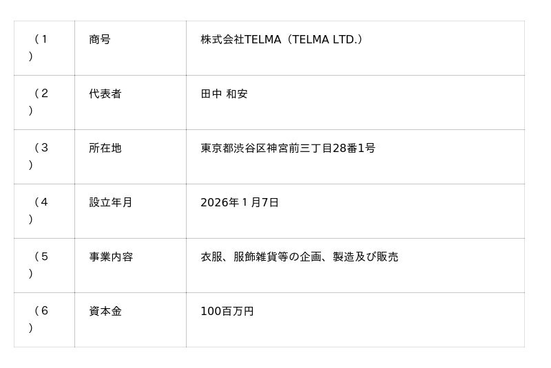 株式会社ユナイテッドアローズ(代表取締役 社長執行役員 CEO: 松崎 善則、本社所在地:東京都渋谷区)は、デザイナー中島輝道氏のブランド「TELMA」の事業取得に伴い、2026年1月7日付で、株式会社TELMAを設立いたしました。