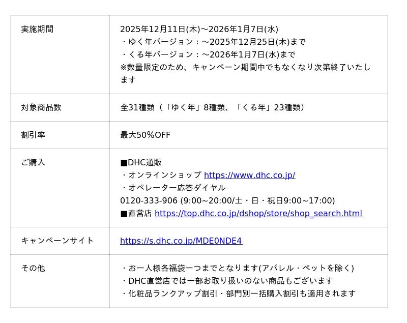 今年は、「ゆく年」「くる年」の2つのバージョンをご用意しました。期間中、DHC通販および全国の直営店にて、“中身がわかる福袋”を、数量限定で販売いたします。売切れ御免の福袋、年末年始も美しく健やかに、この機会をぜひご活用ください。