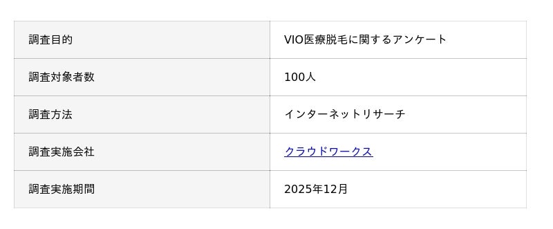 VIO医療脱毛を受けた経験がある100名を対象に、全6項目のアンケートを実施しました。